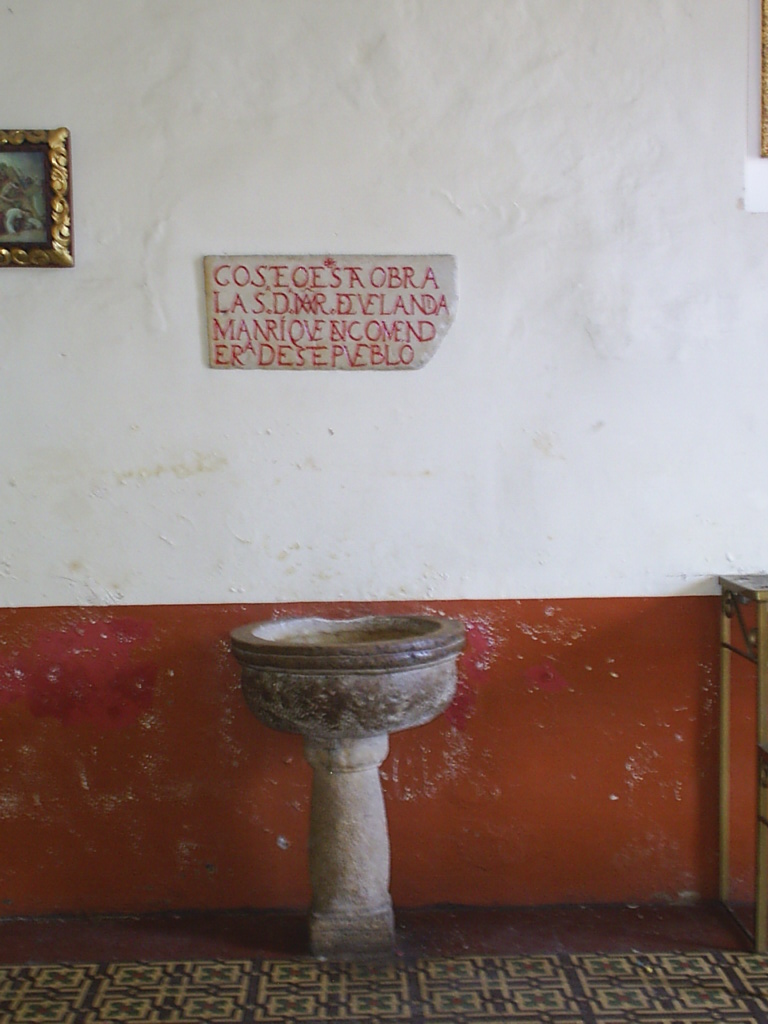 Sobre ellas se encuentran dos cartelas que son de suma importancia. La del lado izquierdo reza lo siguiente: «HISO ESTA IGLESIA SIENDO CURA EL RP JV.º DE ZETINA JACINTHO PATIÑO. AÑO DE 1678». Por su parte la de la derecha señala «COSTEÓ ESA OBRA LA S.ª D.ª M.ª R. DE VELANDIA MANRIQUE ENCOMENDERA DE ESTE PUEBLO».
